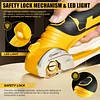 【SAFETY START & PROTECTION】SakerPlus cordless electric scissors prioritize safety at every stage. Its safety start necessitates a deliberate press of the safety switch followed by triggering, ensuring secure and controlled usage every time. Encased within a metal shield, the blade leaves only a small cutting opening, guaranteeing a safe cutting experience without concerns of accidental cuts. Additionally, the front LED light enhances visibility in low-light environments.